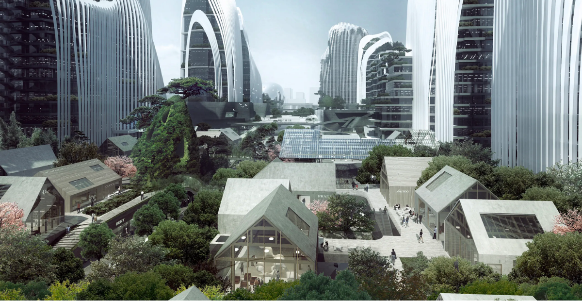 Complexo multiuso de 560.000 m² de blocos de torres, prédios baixos, vias públicas e espaços verdes.